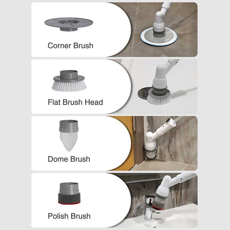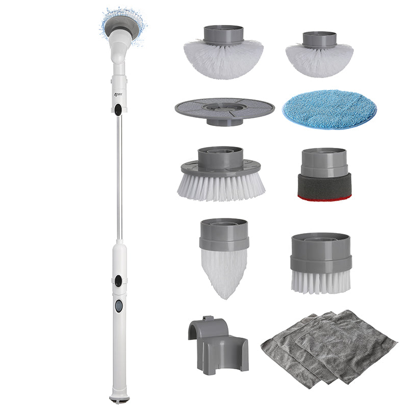 Accessories included: main scrubber head, pointed corner brush, large rounded brush, rounded toilet brush, small flat brush, large flat brush, polishing attachment and a sponge brush. Additional tools: 53cm extension pole, mesh accessory storage bag, charger.