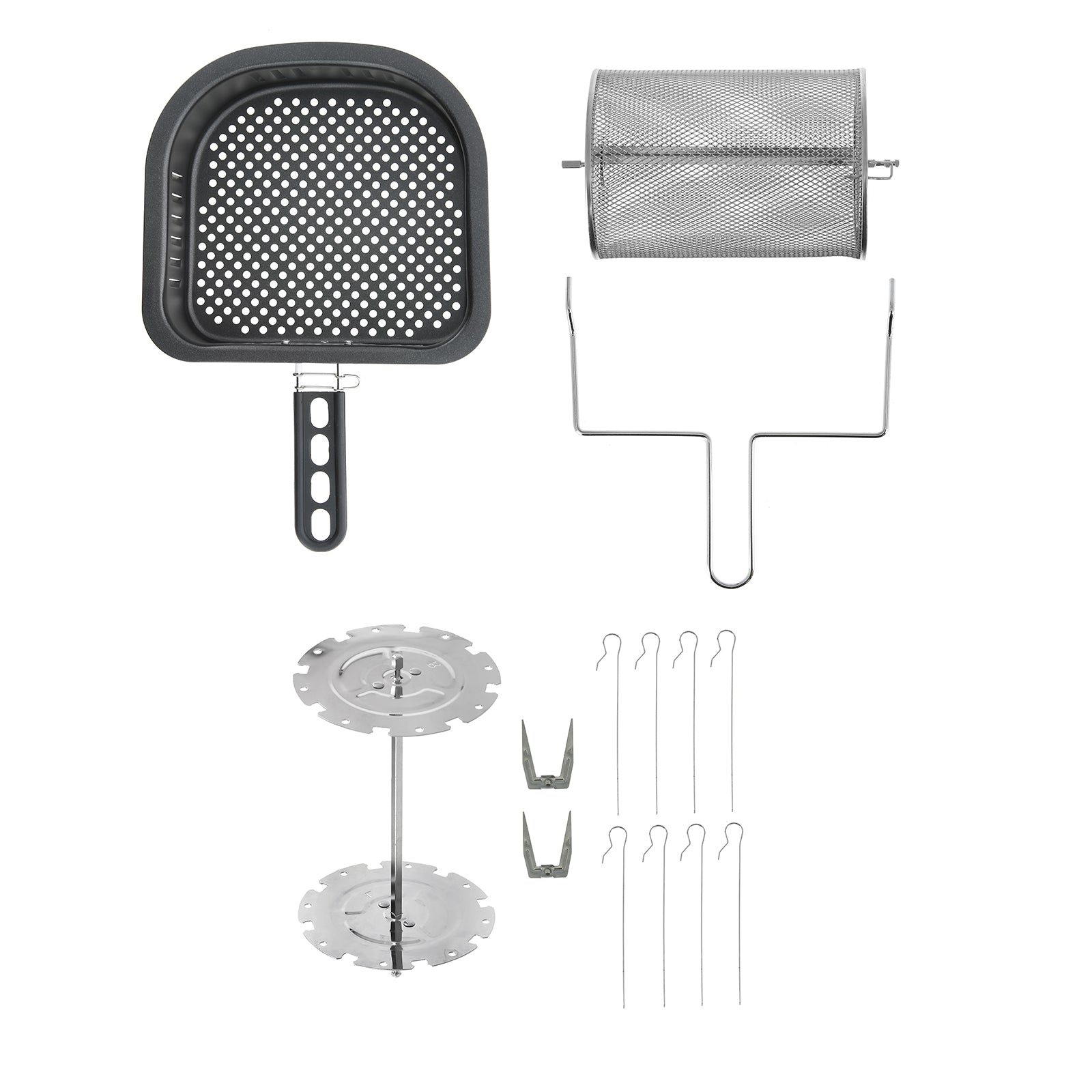 - Included Accessories: Crisper Basket, Crisper Basket Handle, 3 x Mesh Grill Racks, Oil Drip Tray, Rotisserie Spit, Rotisserie Handle